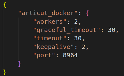 The advanced configuration file settings.conf is located in the ArticutDocker directory. You can adjust the number of workers (recommended based on the number of CPUs), timeout, port location (default is 8964), etc., according to your machine's specifications.